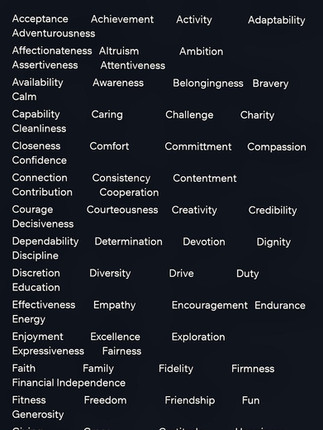 Here is a list of possible values you may hold close to your heart. Please add your own if you don't see it included, remember the possibilities are endless. Pick out your top 5 values and write them down somewhere you will see them and be reminded of them everyday. Your bathroom mirror or the fridge are good places. It is usually hard to select only 5. You might need to select more than 5 and then keep paring down the list by considering what you can live without.